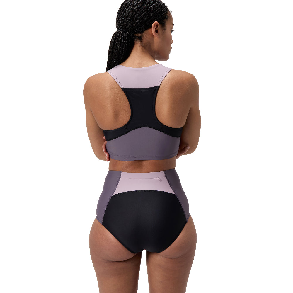 On the board, in the ocean, wherever your adventure takes you. Our versatile new boyleg brief flexes to your environment so you can explore new horizons. Cut in a racerback style for maximum mobility, it includes removable bra pads and flattering tonal panels. Rest easy, knowing the durable fabric resists chlorine and pilling. Designed with a handy back zip pocket and a full mesh lining to promote water flow. Body made of 80% Nylon, 20% Elastane (Creora Regen).