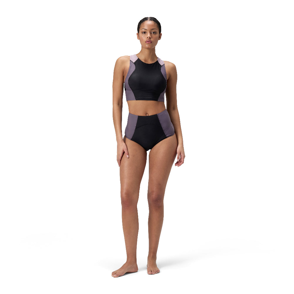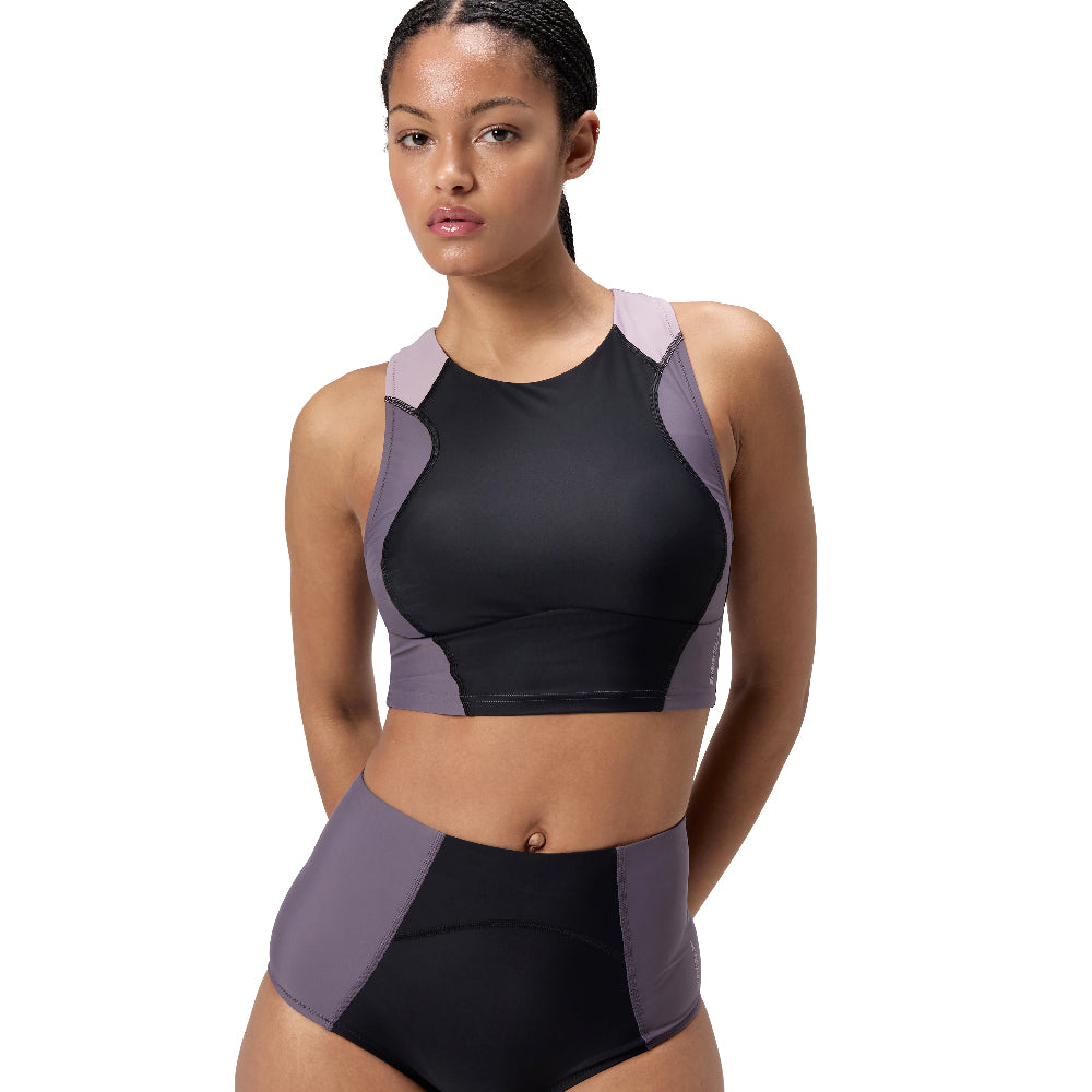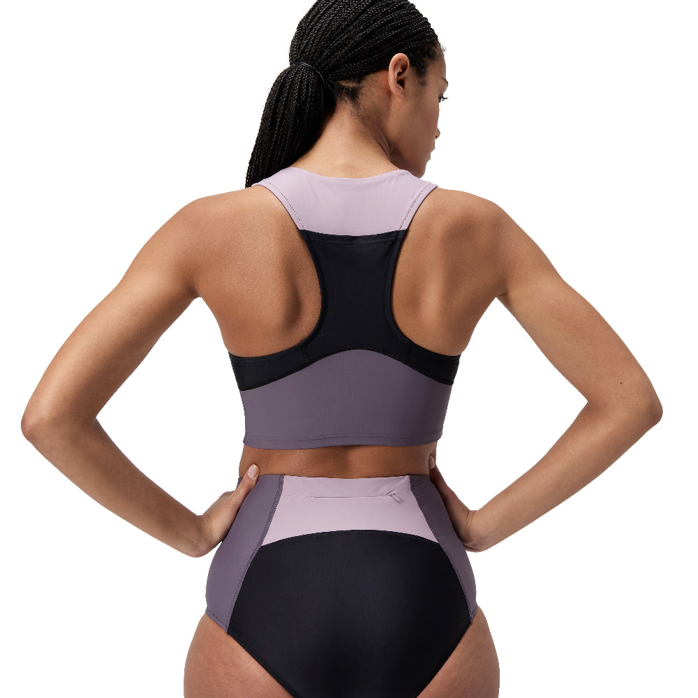 On the board, in the ocean, wherever your adventure takes you. Our versatile new racerback crop top flexes to your environment so you can explore new horizons. Cut in a racerback style for maximum mobility, it includes removable bra pads and flattering tonal panels. Rest easy, knowing the durable fabric resists chlorine and pilling. Designed with a handy back zip pocket and a full mesh lining to promote water flow. Our new Biofuse swimwear range is made from Ocean Flex fabric made using spandex and nylon from ghost fishing nets. Body made of 80% Nylon, 20% Elastane (Creora Regen).