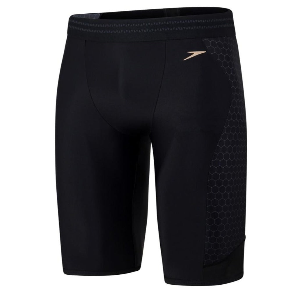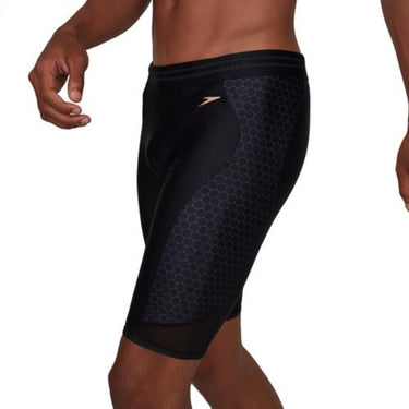 Sleek and stylish jammer with a flash of gold and side panels featuring our modern hexagonal print in vibrant green glow for a sporty look for a sporty look. The mesh panel on the leg enhance your swim experience, and a wider waistband with inbuilt drawcord reduces pressure and gives you extra comfort while maintaining security. Using our PowerFlex Eco fabric, which is made from recycled yarns, is chlorine resistant and feels soft against the skin so it's good for you and good for the environment.