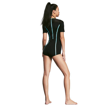 Emerging from the legendary swimsuit, a new evolution takes place. Reinvigorating the HERO series with fresh elements by combining different fabric types and textures, and designed to wrap your body for shaping while moving without limits. This Hero 6 short-sleeve Low Leg 1 piece is a pitch black base paired with light reflecting aurora-inspired lines, crafting a three-dimensional masterpiece in the interplay of light and shadow. Swim fearlessly with our light-reflecting design details which also enhance the muscles contours for a streamlined look and a stand collar design for enhancing the neck silhouette. This suit also shapes and sculpt your body while maintaining the tension balance for unleashing your full power in water.