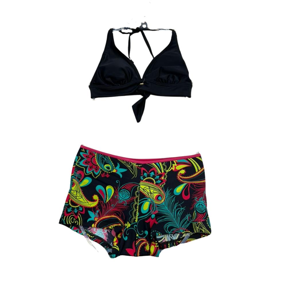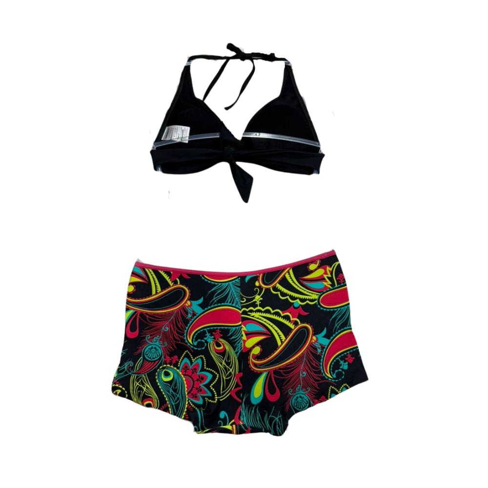 This 2pc set features a plain black triangle bikini top paired with printed paisley boyleg shorts, silhouetted on a higher v-neck and boyleg short for extra coverage offering a flattering and trendy fit.