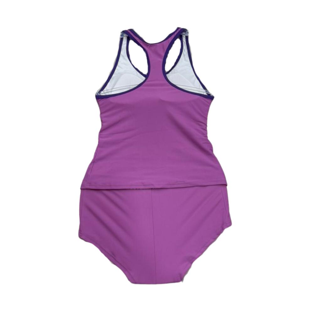 This 2pc set features a blue and yellow striped center panel on a solid purple base, this striped pattern can also be seen on the waistband of its matching boyleg shorts -silhouetted on a higher v-neck and boyleg short for extra coverage offering a flattering and trendy fit.