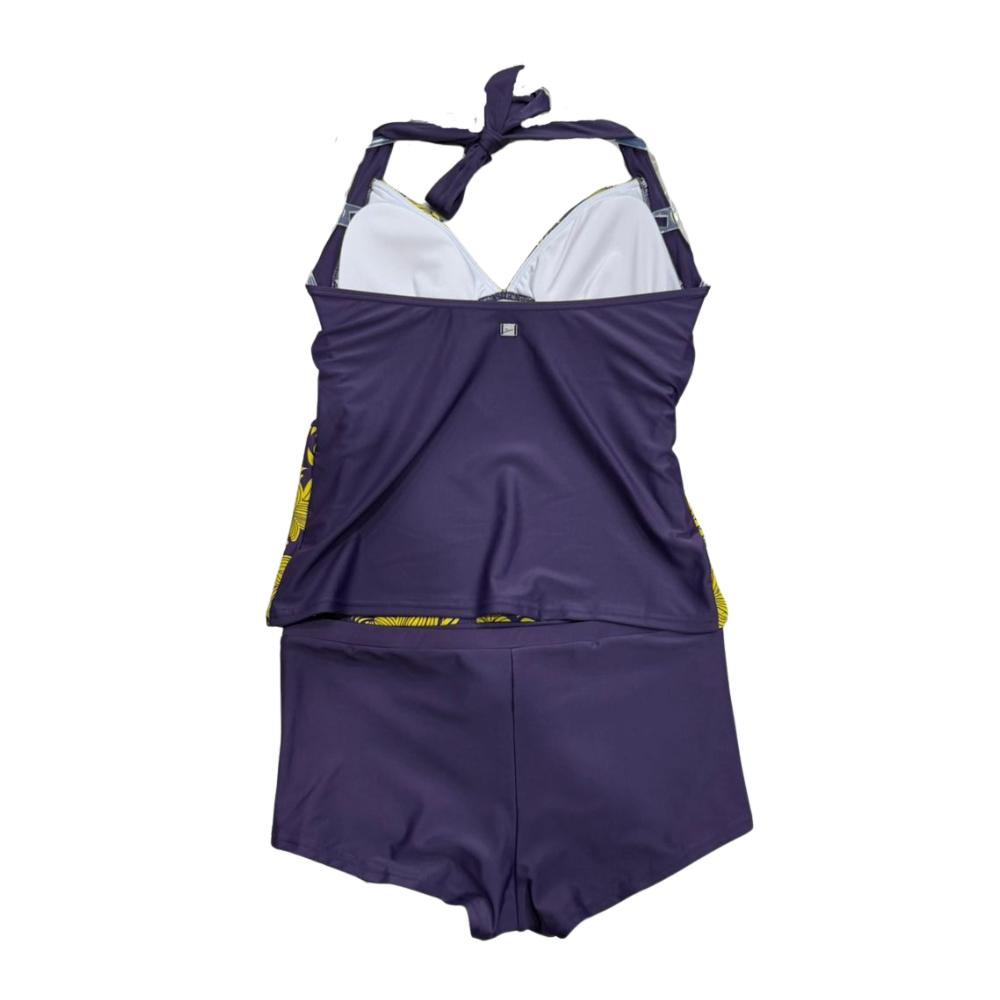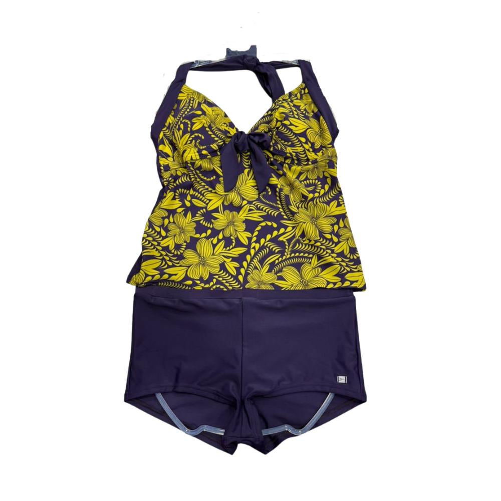 This 2pc set features yellow floral inspired pattern on a deep purple base, perfectly paired with purple boyleg bottoms, silhouetted with a ruched v-neck and a bow that offers a flattering and trendy fit.