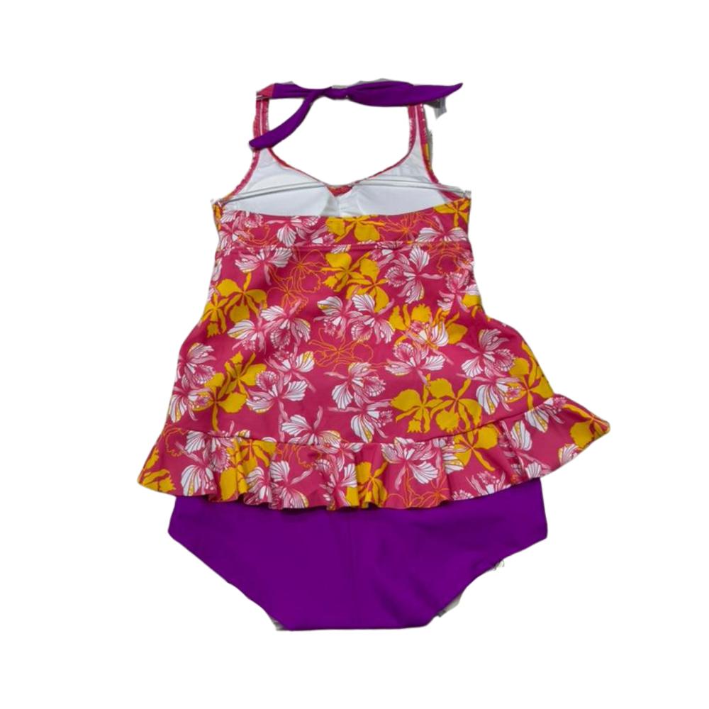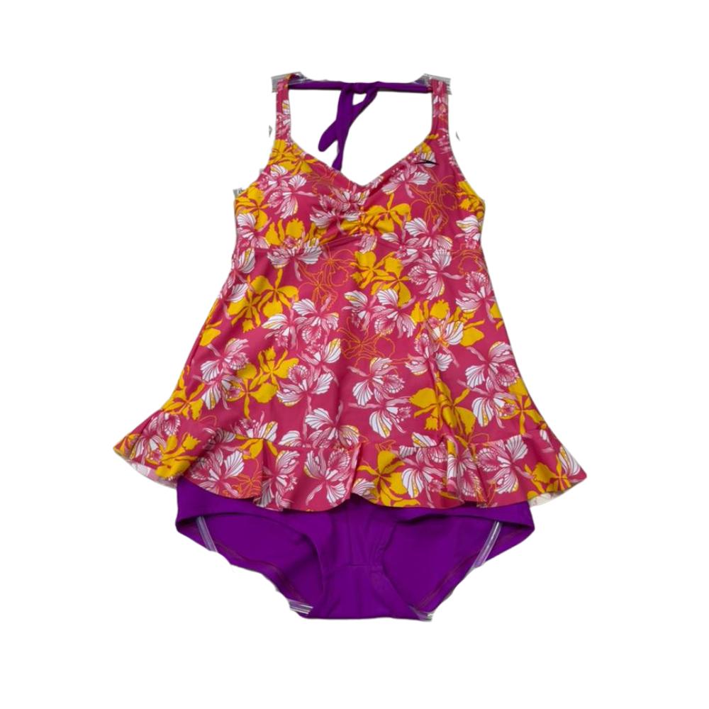 This 2pc set features an orange and white floral inspired pattern on hues of pink, perfectly paired with purple boyleg bottoms than match the halter neck strap, silhouetted with a ruched v-neck and flares at the bottom offering a flattering and trendy fit.