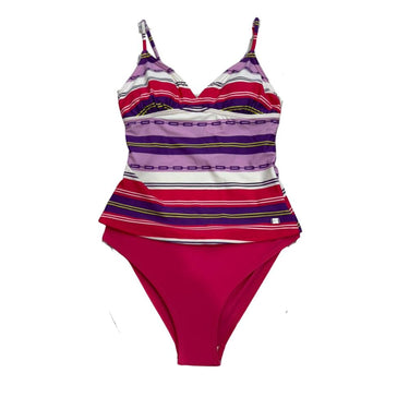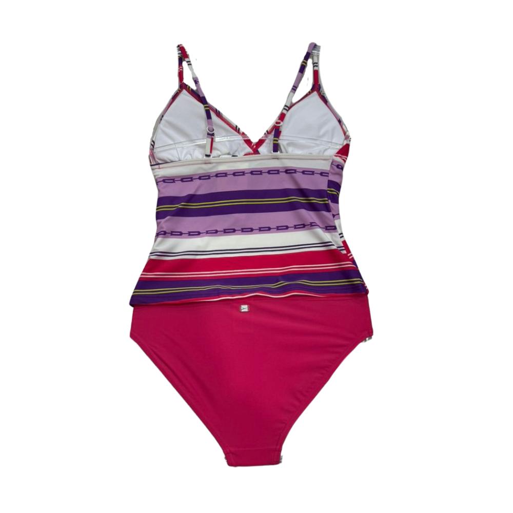 This 2pc set features a striped allover top and solid pink higher coverage bikini bottoms, silhouetted on a v-neck top while adjustable straps for perfect fit offering a flattering and trendy fit.