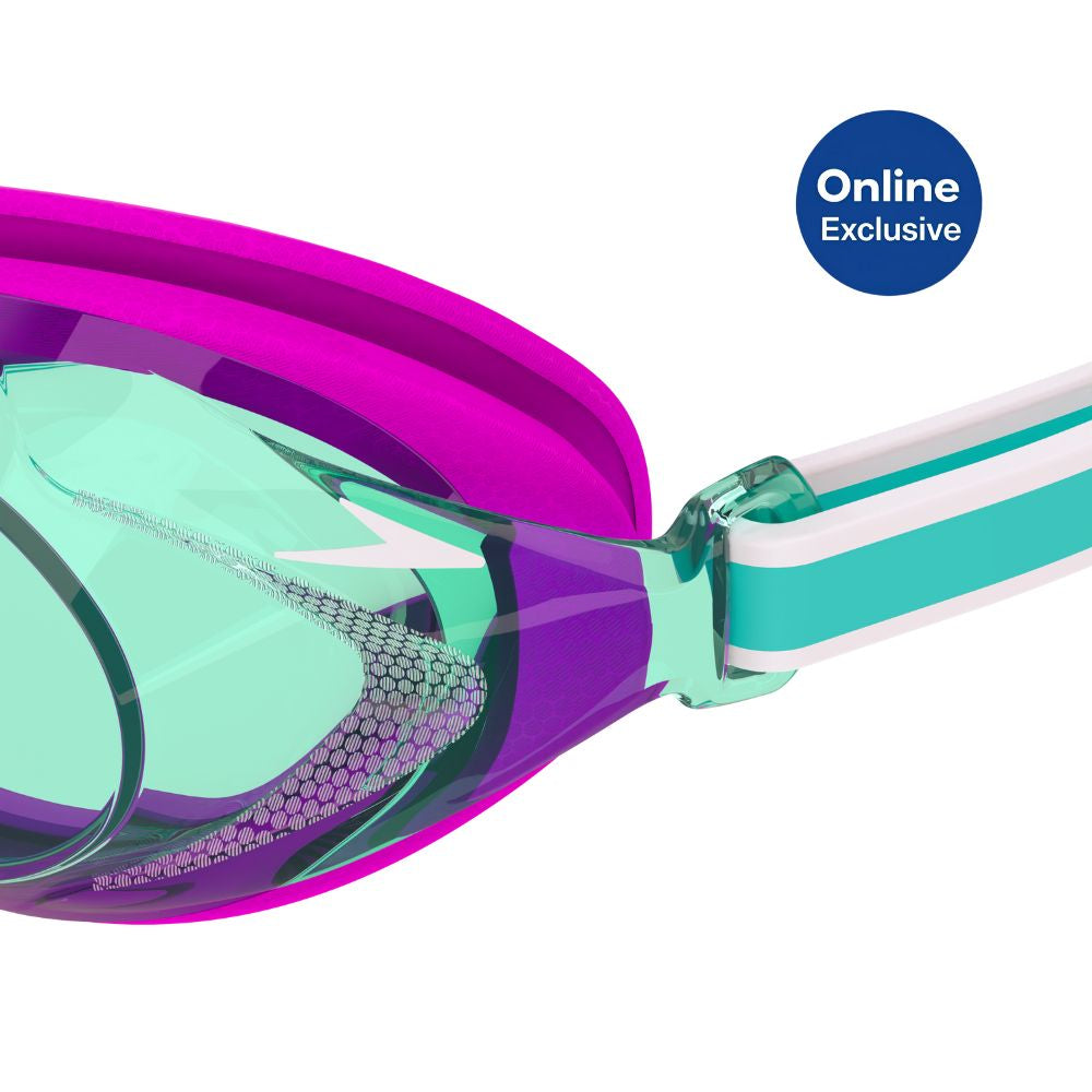 Speedo Junior Vanquisher 3.0 Goggle with purple frame, mint green lenses, and white/teal strap. Speedo Junior Vanquisher 3.0 Goggle with purple frame, mint green lenses, and white/teal strap.