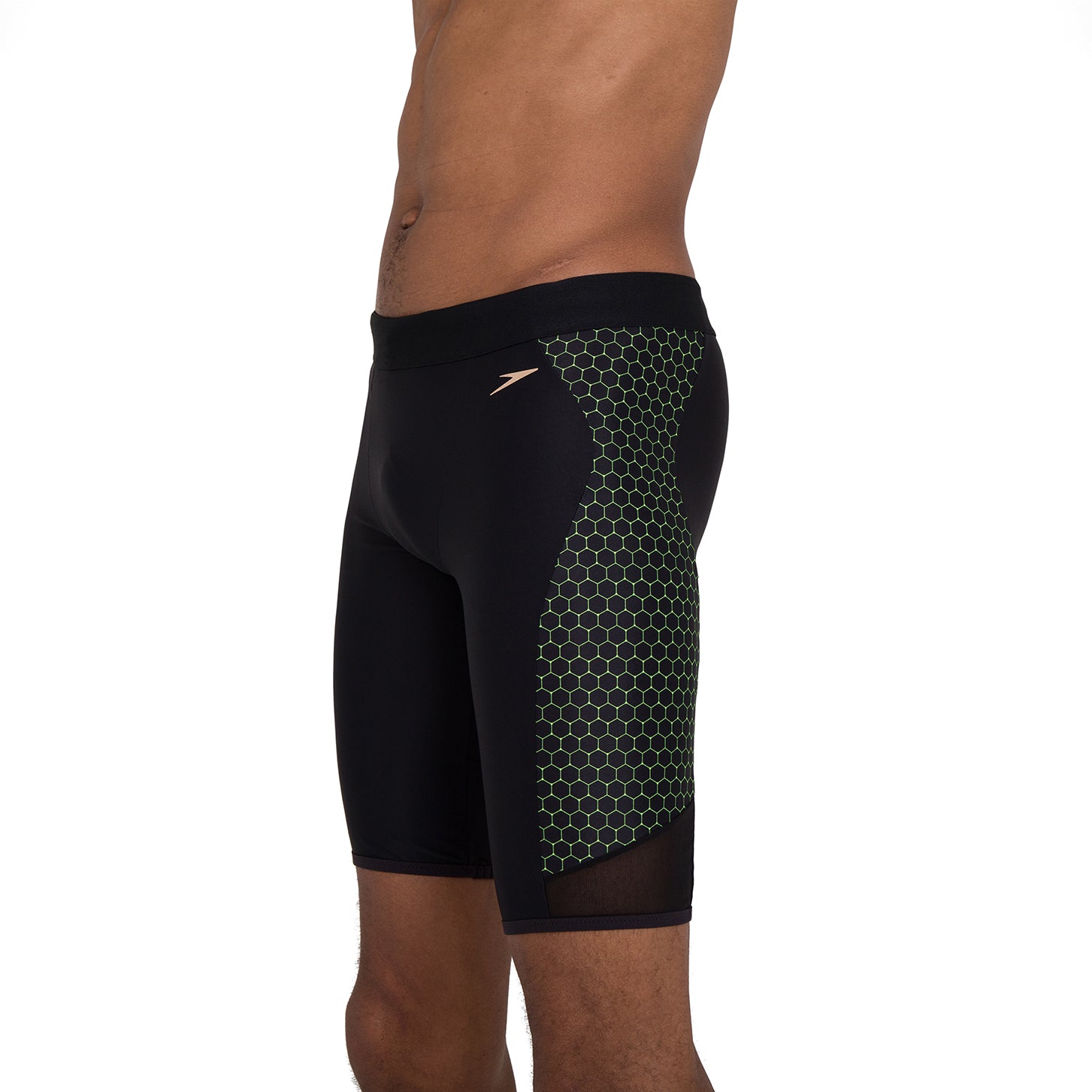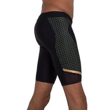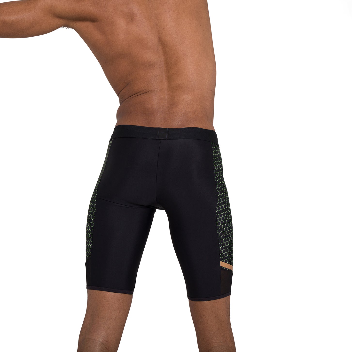 Sleek and stylish jammer with a flash of gold and side panels featuring our modern hexagonal print in vibrant yellow for a sporty look.