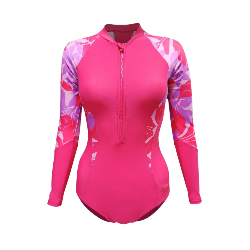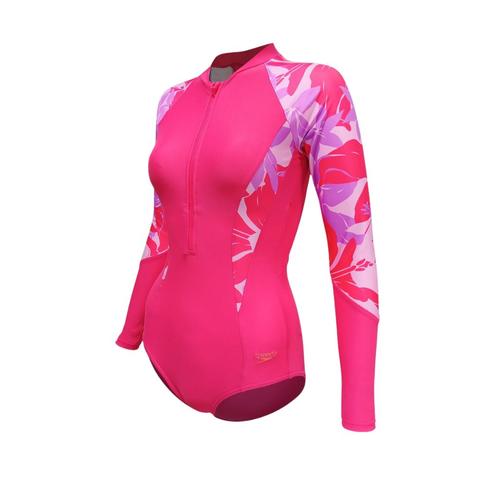 Enjoy your summer with Speedo's Aloha vibes! Escape to exotic lands, real or imagined, with our Long Sleeve Paddle Suit has a sleek black design that features panels of our a floral center piece in a bright pink and lilac. Ideal for fun times on the board and beach, the all-in-one suit includes a front zip opening and removable bra pads for modesty and support. Offering full coverage across the chest, back and arms, it’s great for long days on and off the board. Designed to be durable and better for the environment, it’s made from our Endurance10 fabric, which has shape retention- stretchable fabric for freer movement, 100% chlorine resistant and quick-drying.